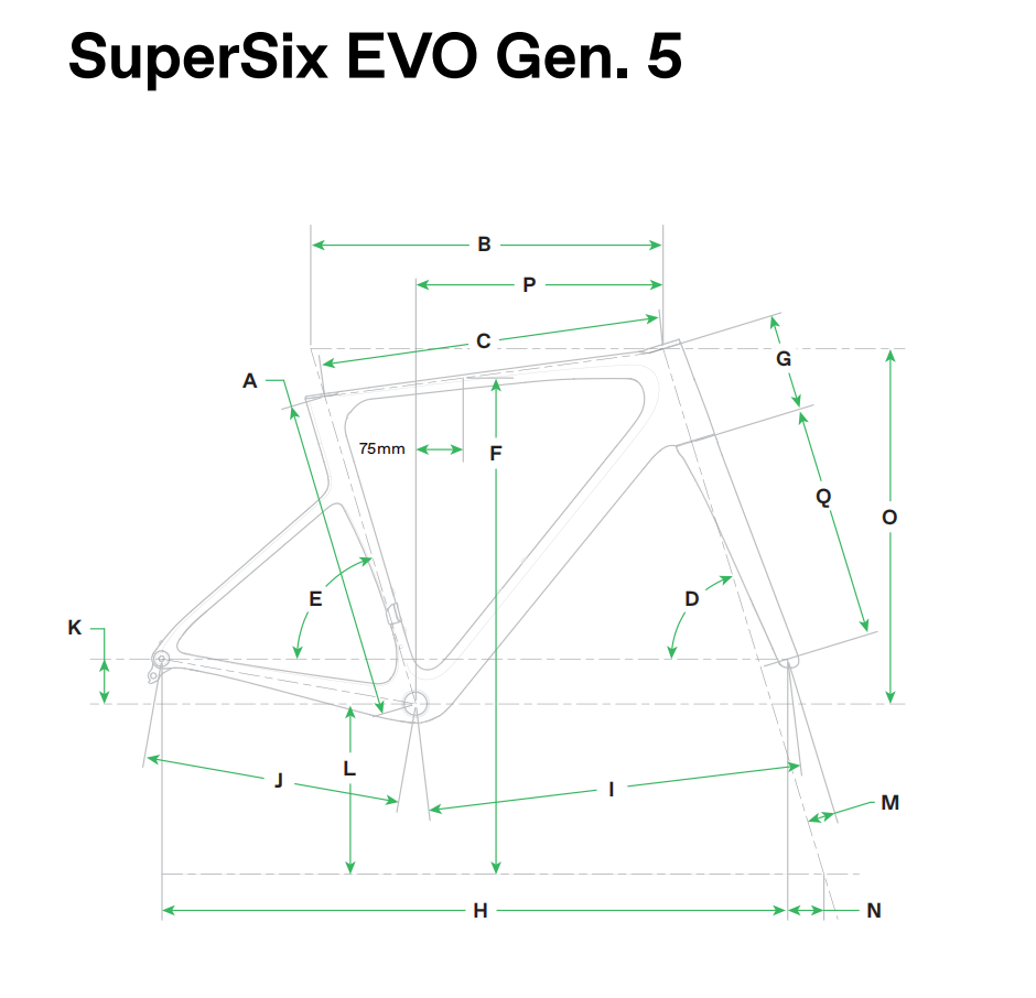 核心配置(全配色通用)类别配置详情车架LAB71 SuperSix EVO 第五代,超轻 Series 0 碳纤维材质,12×142mm 贯穿轴,68mm BSA 螺纹中轴,平装式碟刹,一体式座管夹,UDH 通用吊耳前叉LAB71 SuperSix EVO 第五代,超轻 Series 0 碳纤维材质,一体式碗组座,12×100mm 贯穿轴,平装式碟刹,内部走线,1-1/8" 至 1-1/4" Delta 舵管;44-54cm 车架搭配 55mm 偏移量,56-61cm 车架搭配 45mm 偏移量碗组一体式,规格 1-1/8" - 1-1/4"座管Cannondale C1 Aero 40 Carbon V2 碳纤维座管,钛合金配件;44-54cm 车架适配 0mm 偏移量,56-61cm 车架适配 15mm 偏移量附赠配件Cannondale Gripper 气动水壶 + CarbonGrip 气动水壶架可选尺寸44cm、48cm、50cm、52cm、54cm、56cm、58cm、61cm配色选项原色(RAW)黑色配 WOW 撞色(WOW)EF 车队复刻色(EFP)注意事项以上配置基于组件供应情况及其他因素可能发生变更,恕不另行通知。车架组仅包含车架、前叉、碗组、座管及附赠配件,不含传动系统、刹车、轮组等其他部件。