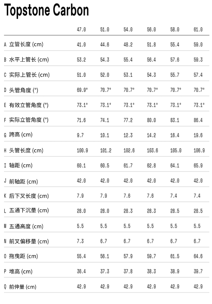 - 车架 Topstone 碳纤维材质,Kingpin 悬挂系统,比例响应结构,下管 Stashport 储物口,内走线,12×142 毫米贯通轴,支持 27.2 毫米升降座管,UDH 通用后拨吊耳,68 毫米英制螺纹中轴,平装式碟刹,可拆卸挡泥板支架,多种装备 / 水壶架安装位